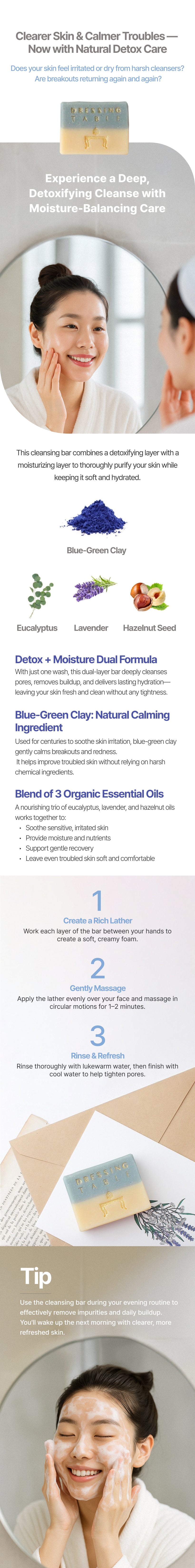 Experience a gentle yet effective cleanse with our premium Cold Process natural bar, made with over 99% naturally derived ingredients. Designed with a dual-layer formula—detoxifying blue-green clay + moisture-rich oils—this bar deeply purifies the skin without stripping essential hydration.